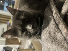 Note: All grey with a white tip on her tail and bright yellow eyes